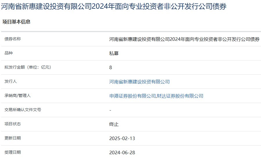 【大河财立方消息】2月14日,上交所债券项目信息平台显示,河南省新惠建设投资有限公司2024年面向专业投资者非公开发行公司债券项目状态已更新为“终止”。
